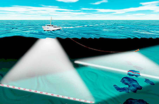 Like other sonar systems, multibeam systems emit sound waves in a fan shape beneath a ship's hull. The amount of time it takes for the sound waves to bounce off the seabed and return to a receiver is used to determine water depth. Unlike other sonars, multibeam systems use beamforming to extract directional information from the returning soundwaves, producing a swath of depth readings from a single ping.